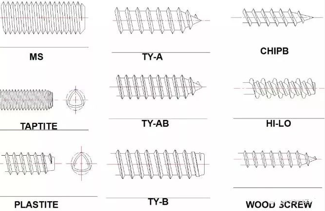 自攻螺紋:裝配時先在裝配物上鉆孔,不需攻內牙,使用較大力矩裝配。